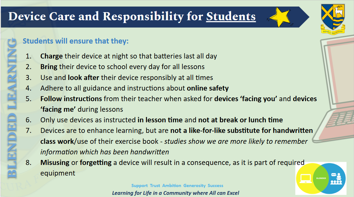 The learning possibilities for Blended Learning are infinite! This continues to be a very exciting opportunity to prepare students for vocations where they will integrate online systems, encourage independent learning and responsibility - both in terms of learning and device upkeep - and offer adapted and deep learning experiences across all areas. We encourage all students to take full responsibility for their device by reiterating the following key points: