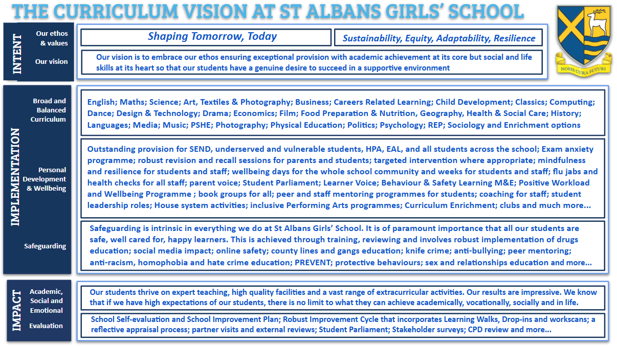 St Albans Girls’ School is a place to thrive. We provide an ambitious, broad and balanced curriculum that is inspiring as well as rich in knowledge and opportunity. It is carefully and expertly designed and delivered to enable all students to achieve their potential.