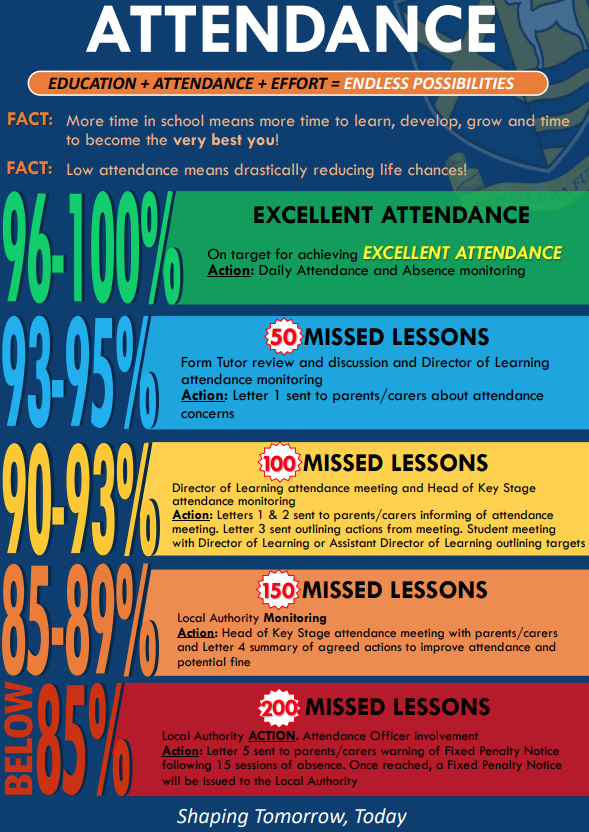 Regular attendance at school is essential to ensure uninterrupted progress and to enable children to fulfil their potential. It is also everyone's business. There is a clear link between good attendance and students achieving best possible outcomes for themselves. Excellent attendance and punctuality are key to a student’s success. The attendance target for all students is for figures to be at least in line with national averages including vulnerable groups throughout the year. Our attendance target is 96%. The school takes guidance from the DfE document - Working Together to Improve School Attendance (August 2024)