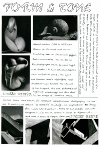 The course provides students with the opportunity to develop visual skills and to express ideas by working through a variety of projects.There are opportunities to experiment with different types of photography in order to explore individual strengths and preferences. A wide range of options are available and it is possible to specialise or to work in several areas. Knowledge of contemporary and historical Photography is acquired through work in school and by visiting galleries, museums, workshops and studios.